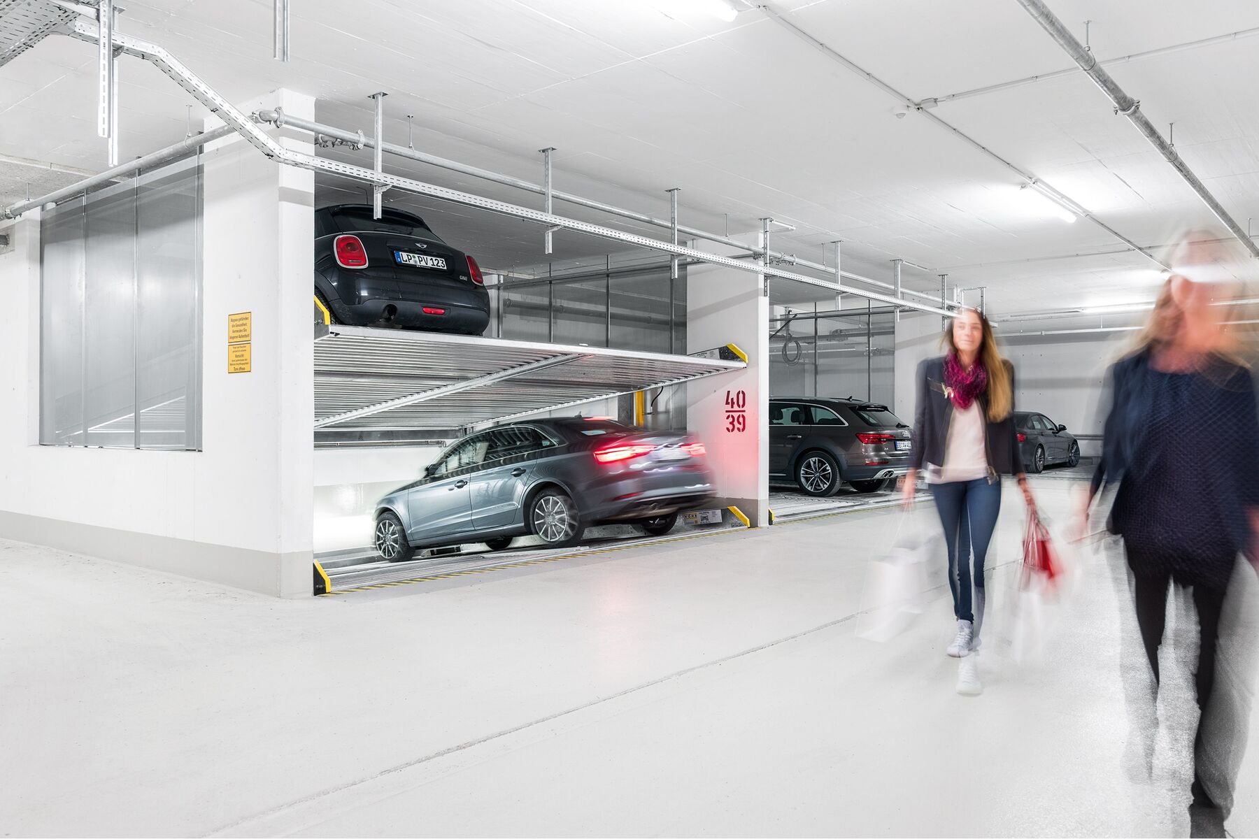 In volautomatische systemen, zoals de Levelparker, Parksafe en Multiparker, komt de "Parkeerplaats naar de bestuurder" - het is dan niet nodig om op zoek te gaan naar de auto. De transferzones maken het in- en uitstappen gemakkelijk en besparen de gebruiker de moeite van ingewikkeld manoeuvreren. Een verticale lift brengt de auto's op parkeerplatforms over in het reksysteem. Als zodanig worden ze veilig geparkeerd en blijven ze onaangeroerd. Met geautomatiseerde parkeeroplossingen kunnen honderden voertuigen worden geparkeerd in torens of high-rack systemen op verschillende parkeerniveaus.